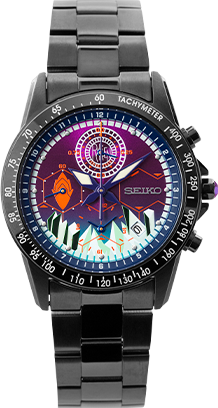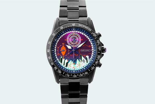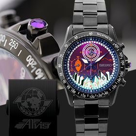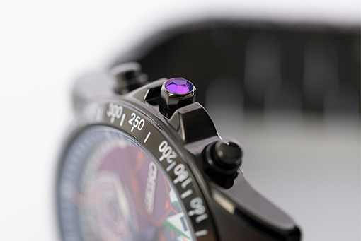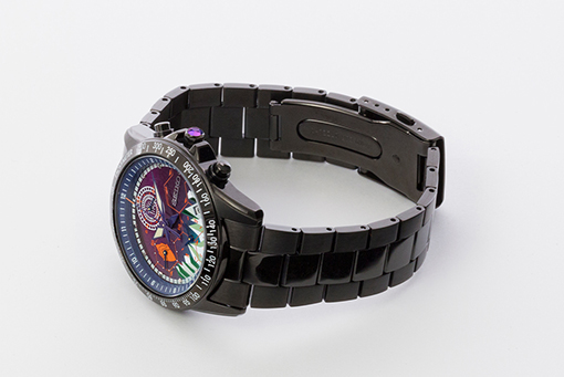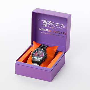 禍々しさを纏ったマークニヒトを彷彿とさせる仕上がり。バックルにアルヴィスのロゴとエンブレムを刻印し、りゅうずにはパープルのガラスをあしらっています。