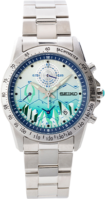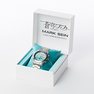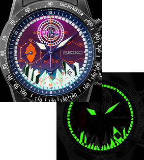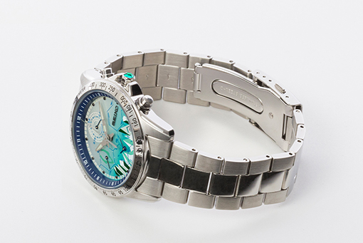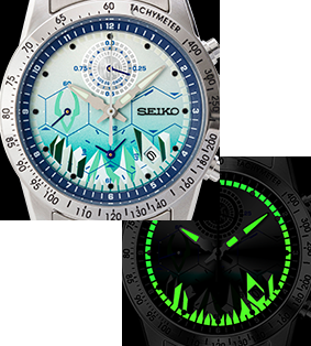 コックピット内部を想起させる文字盤には、マークザインの象徴的なモチーフを配置しています。積算計には一騎が働く喫茶店「楽園」のロゴをレイアウト。暗闇で美しく光る蓄光仕様。
