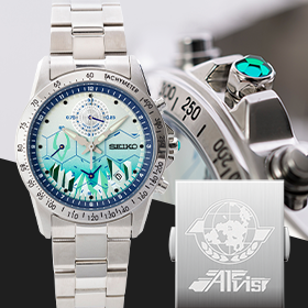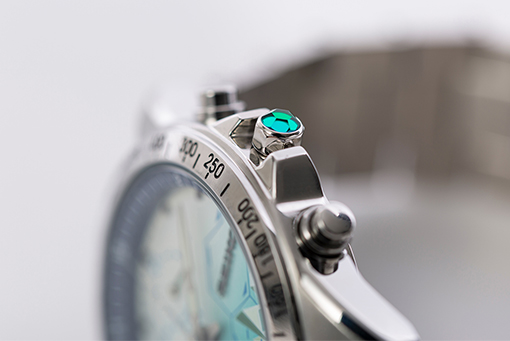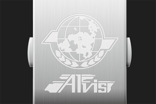 バックルにアルヴィスのロゴとエンブレムを刻印し、りゅうずにはエメラルドグリーンのガラスをあしらっています。